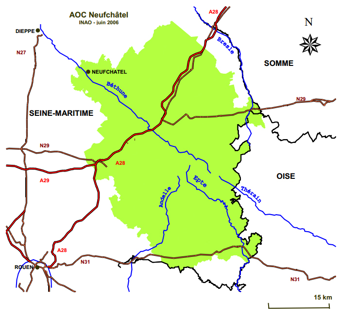 La zone de production AOP est située sur 135 communes de la Seine-Maritime et 1 commune de l’Oise. Dans cette région, la pluviométrie est élevée et les sols argileux. Le réseau de cours d’eau est ainsi dense et le relief parfois accidenté. Le travail au sol est difficile, mais la croissance de l’herbe est plus importante. Les conditions climatiques permettent une mise à l’herbe prolongée des animaux dès mars/avril et jusqu’en novembre/décembre.