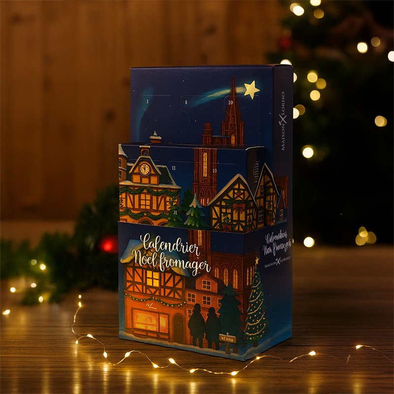 Chaque case renferme un fromage artisanal soigneusement sélectionné. Cette année, le calendrier arbore le charme d’un village typique d’Alsace. Une immersion visuelle et gourmande au cœur des fêtes.
